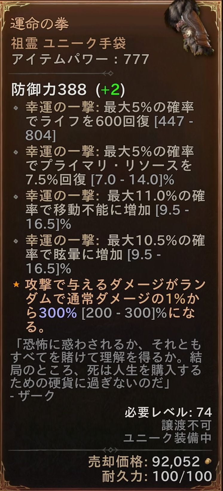 アイテムパワー800超え祖霊武器が店売りしてたけど、affix2つゴミだった(泣)